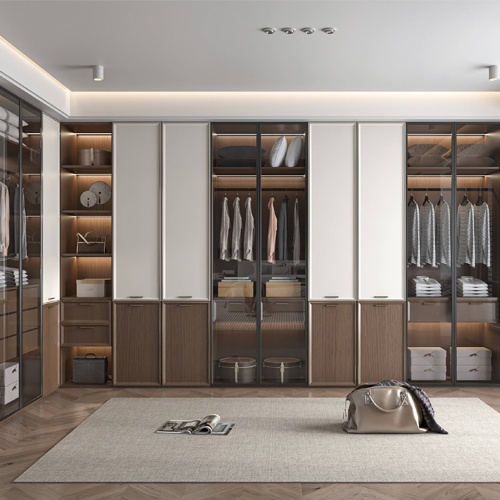 modern wardrobe and closet with aluminum glass door and integrated LED lighting
