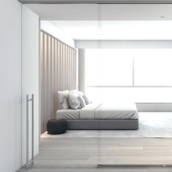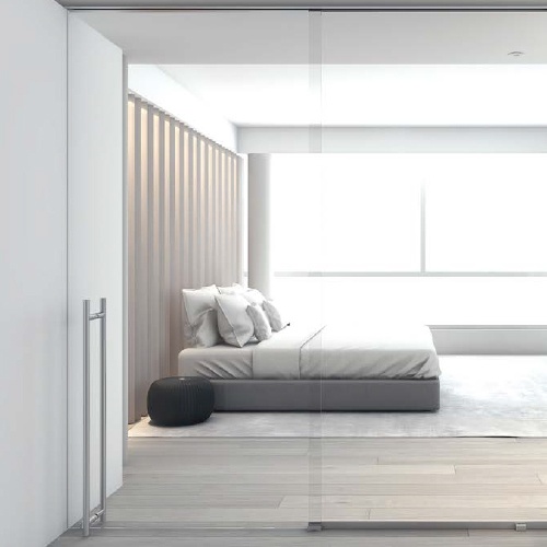 ROLLGLASS® is designed to divide spaces through a combination of fixed and frameless glass sliding doors. The numerous glass panels allow increased light sharing between rooms, creating a modern and clean design. -Ideal for office fronts, conference rooms, bathrooms and bedrooms entrances, showers enclosures, etc. -Minimalist design with a compact clear anodized track holding panels up to 10’ high. -Single extrusion to combine fixed and sliding glass panels for easier and faster installation. -Clean opening free of floor tracks. -Minimal gap between fixed and sliding panels to enhance aesthetic and acoustical features. -Glass panels held through high weight capacity pressure clamps with no glass drillings (use of tempered or laminated glass) for doors up to 385lbs. -Use of 3/8” and ½” glass doors.